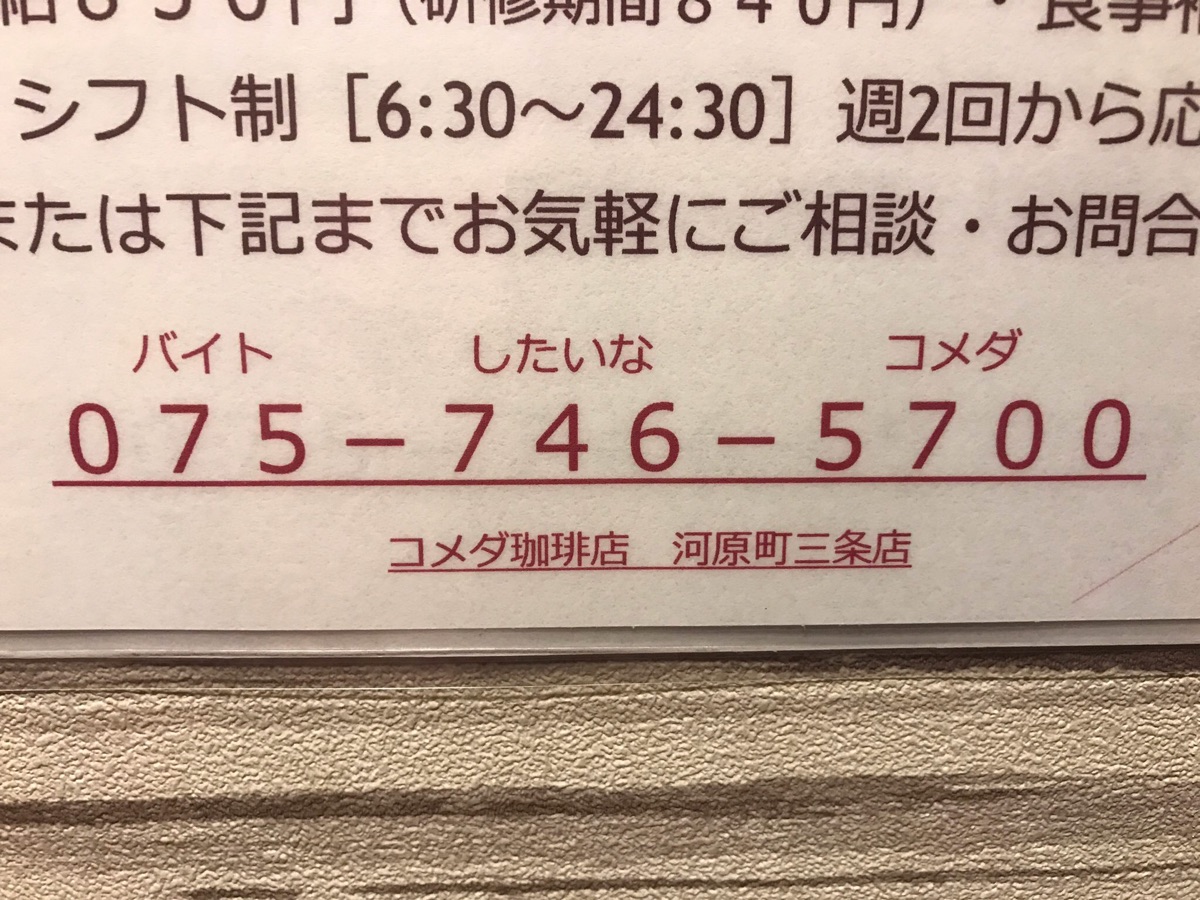 コメダ珈琲店のバイト募集の張り紙。番号の上にそれぽく文字が入っているから覚えやすいのかと思ったら関係ないだろwww